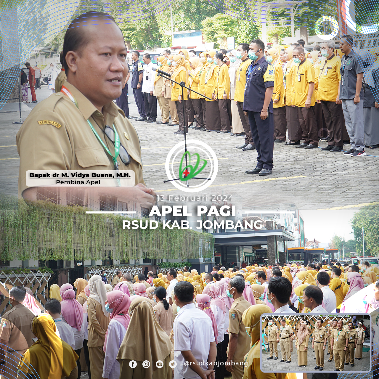 Apel pagi civitas hospitalia RSUD Kabupaten Jombang yang dipimpin oleh Bapak dr Muhammad Vidya Buana, M.H., Kepala Bidang Pelayanan Medik Dan Keperawatan RSUD Kabupaten Jombang dengan amanat terkait "Surat Edaran Kemenkes No. HK.02.01/MENKES/133/2024 tentang Dukungan Pelaksanaan Pelayanan Kesehatan pada Pemilihan Umum dan Pemilihan Kepala Daerah Tahun 2024", Selasa (13/2/2024).