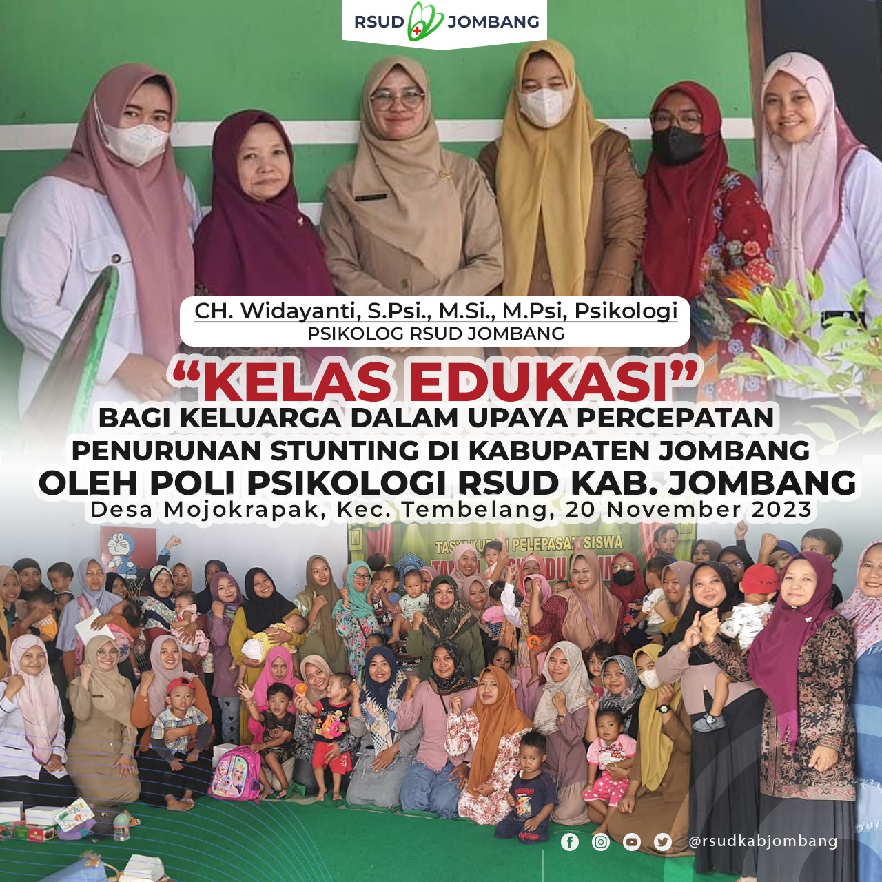 CH. Widayanti, S.Psi., M.Si., M.Psi, Psikolog RSUD Jombang memberikan edukasi psikologi pada “kelas edukasi” bagi keluarga dalam upaya percepatan penurunan stunting di Desa Mojokrapak, Kecamatan Tembelang, Kabupaten Jombang, Senin (20/11/2023).