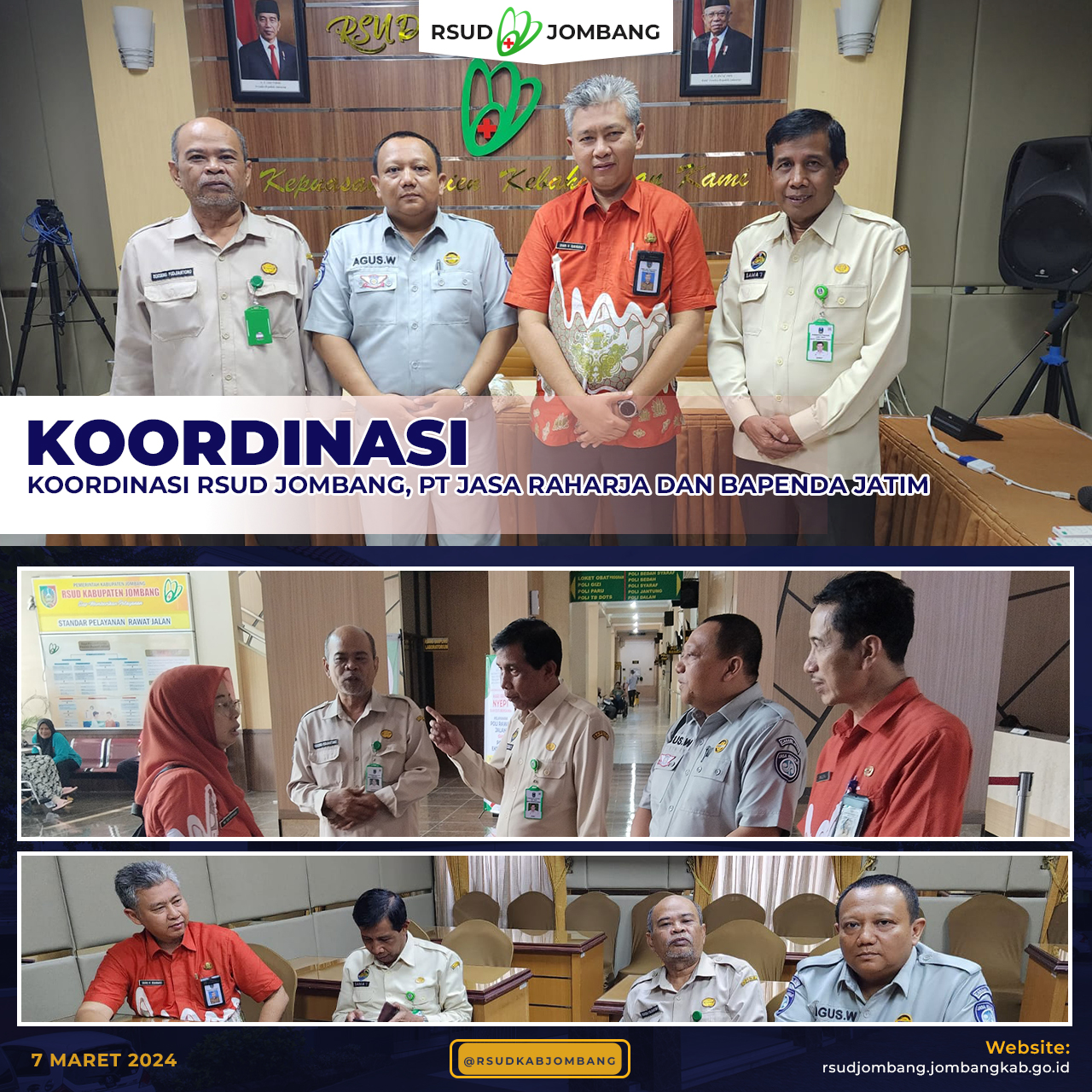 Koordinasi RSUD Jombang, PT Jasa Raharja dan Bapenda Jatim dalam rangka optimalisasi penerimaan pajak kendaraan bermotor, Kamis (7/3/2024).