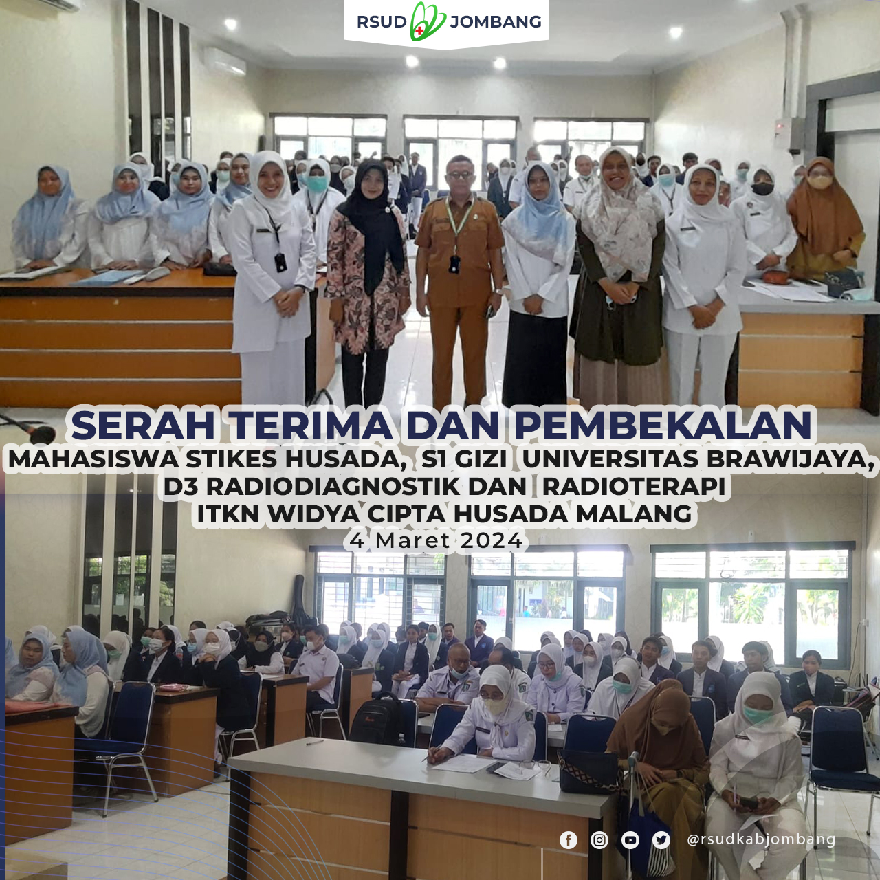 Penerimaan dan Pembekalan Mahasiswa Stikes Husada, S1 Gizi Universitas Brawijaya, dan D3 Radiodiagnostik Dan Radioterapi ITKN Widya Cipta Husada Malang oleh Sekretaris Satkordiklat RSUD Jombang, Bapak Sutikno, S.Kep.Ns., M.Kes, Senin (04/03/2024).