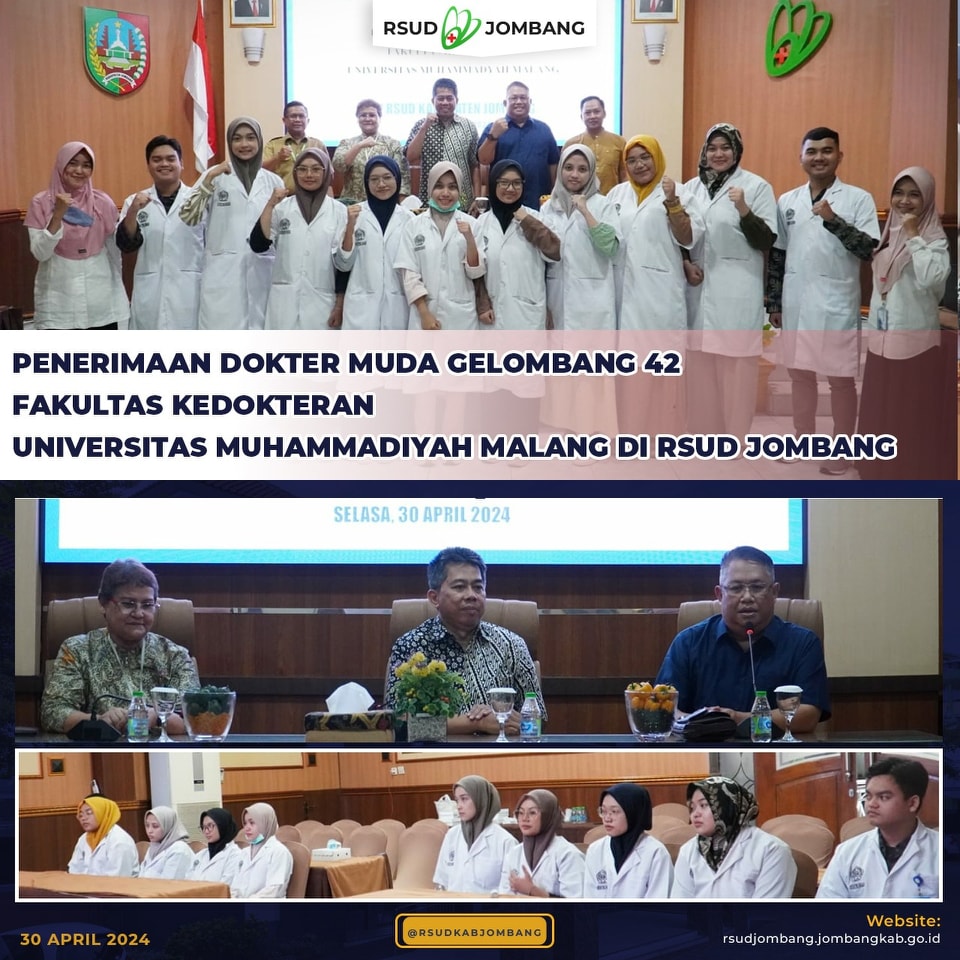 Penerimaan Dokter Muda Gelombang 42 Fakultas Kedokteran Universitas Muhammadiyah Malang bertempat di ruang pertemuan Bung Hatta RSUD Jombang, Selasa 30/04/2024