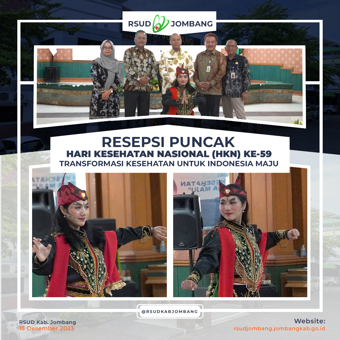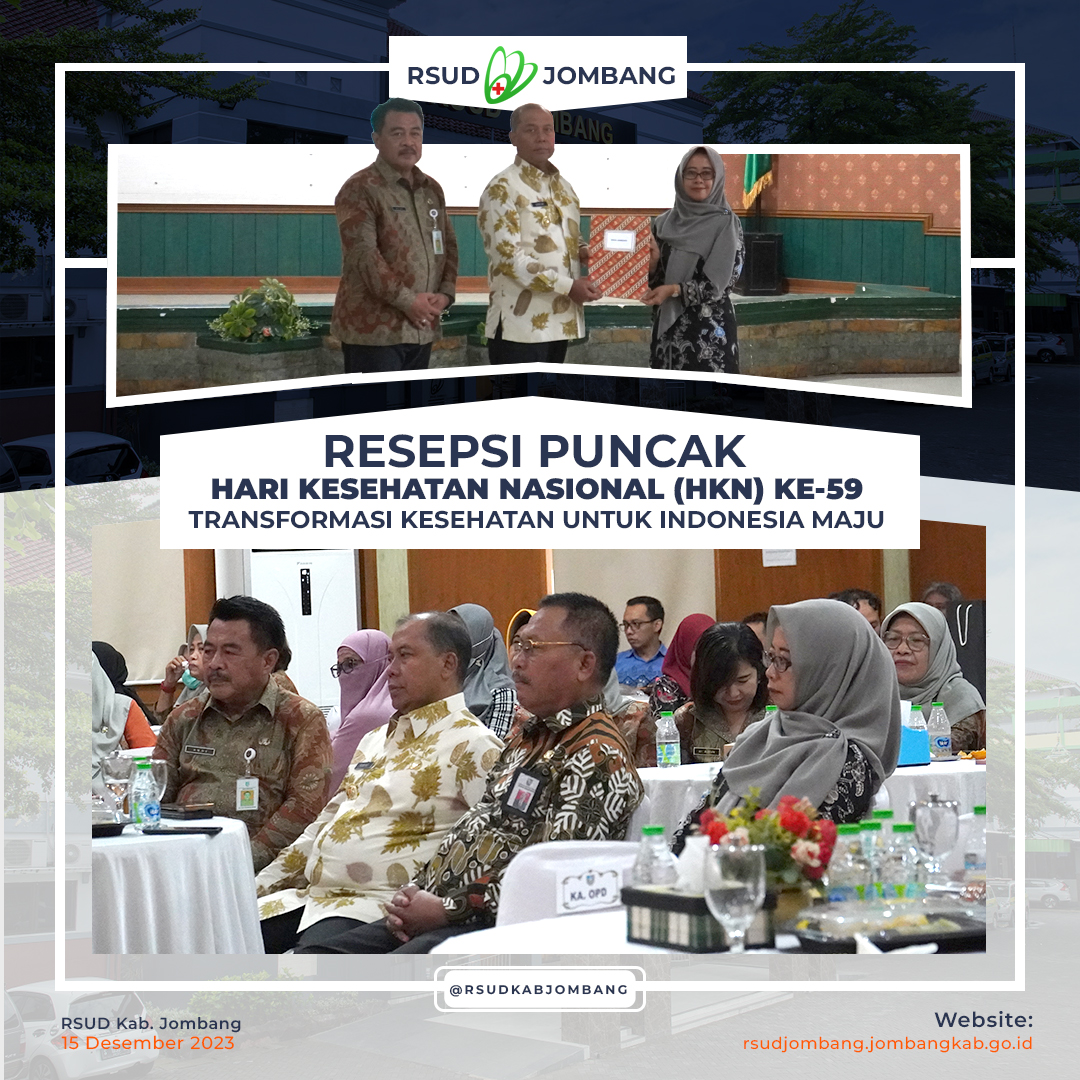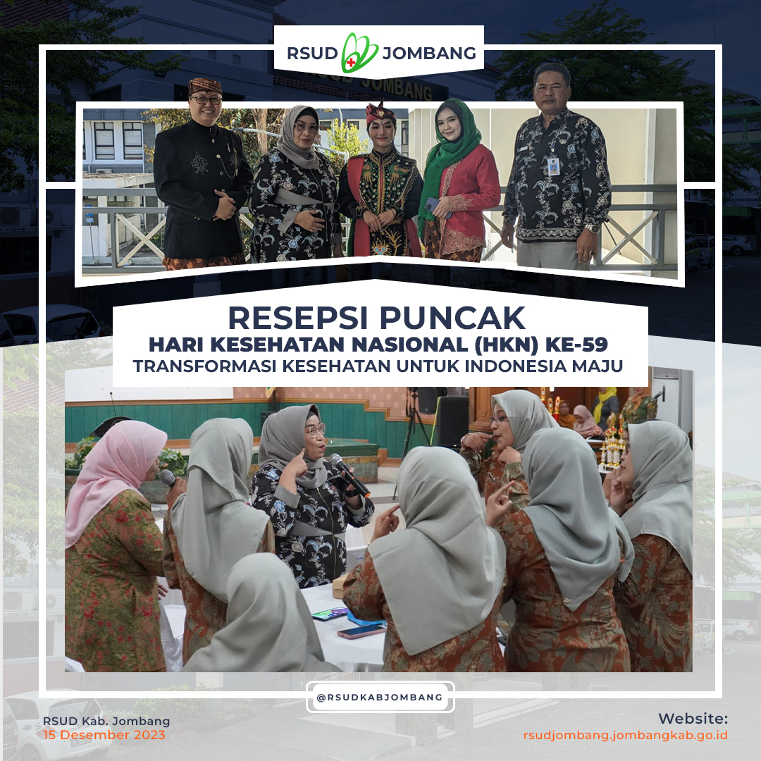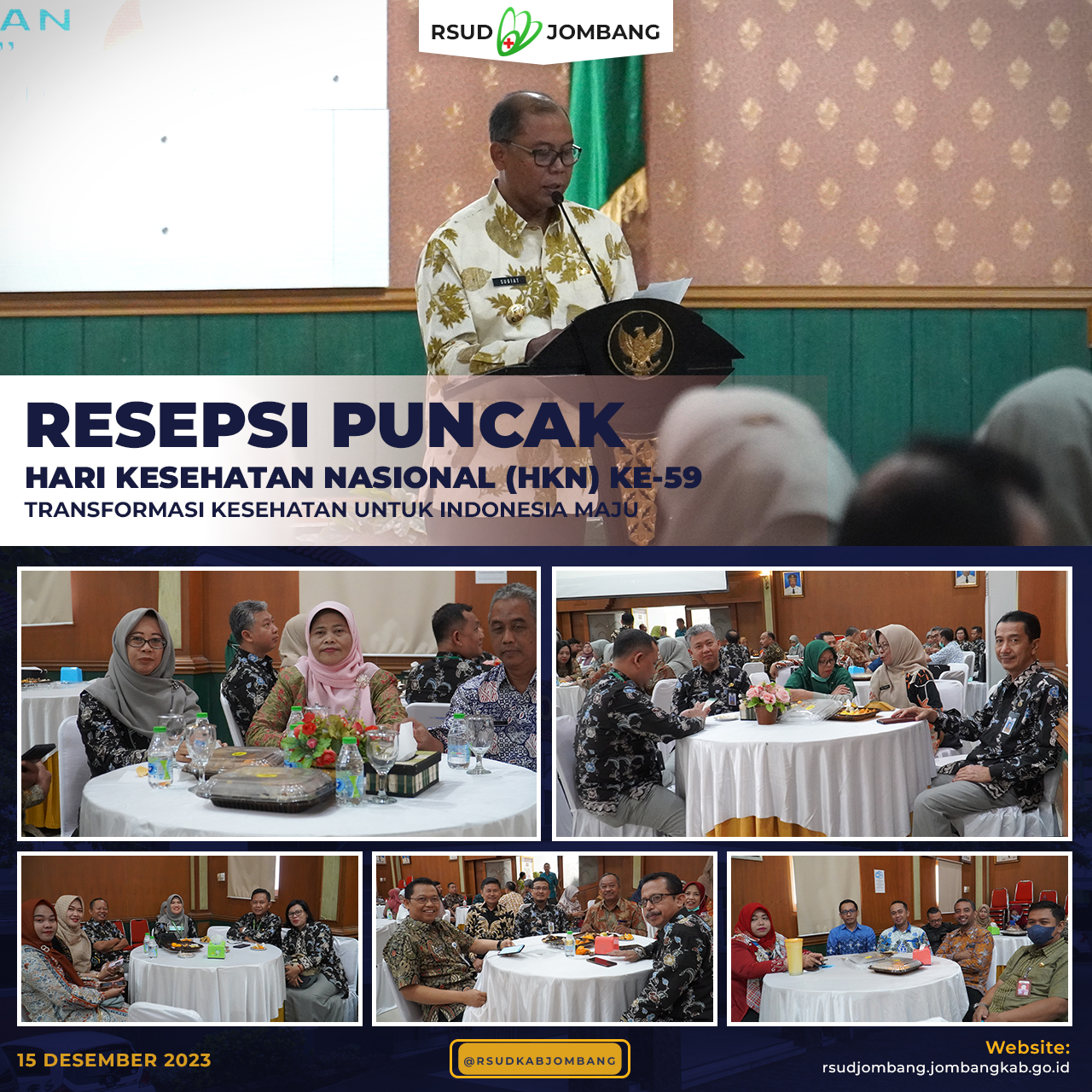 Direktur RSUD Jombang, Ibu Dr. dr. Ma'murotus Sa'diyah, M.Kes. bersama Civitas Hospitalia RSUD Jombang menghadiri acara Resepsi Puncak Hari Kesehatan Nasional ke-59 di ruang pertemuan Bung Tomo, Jumat (15/12/2023)