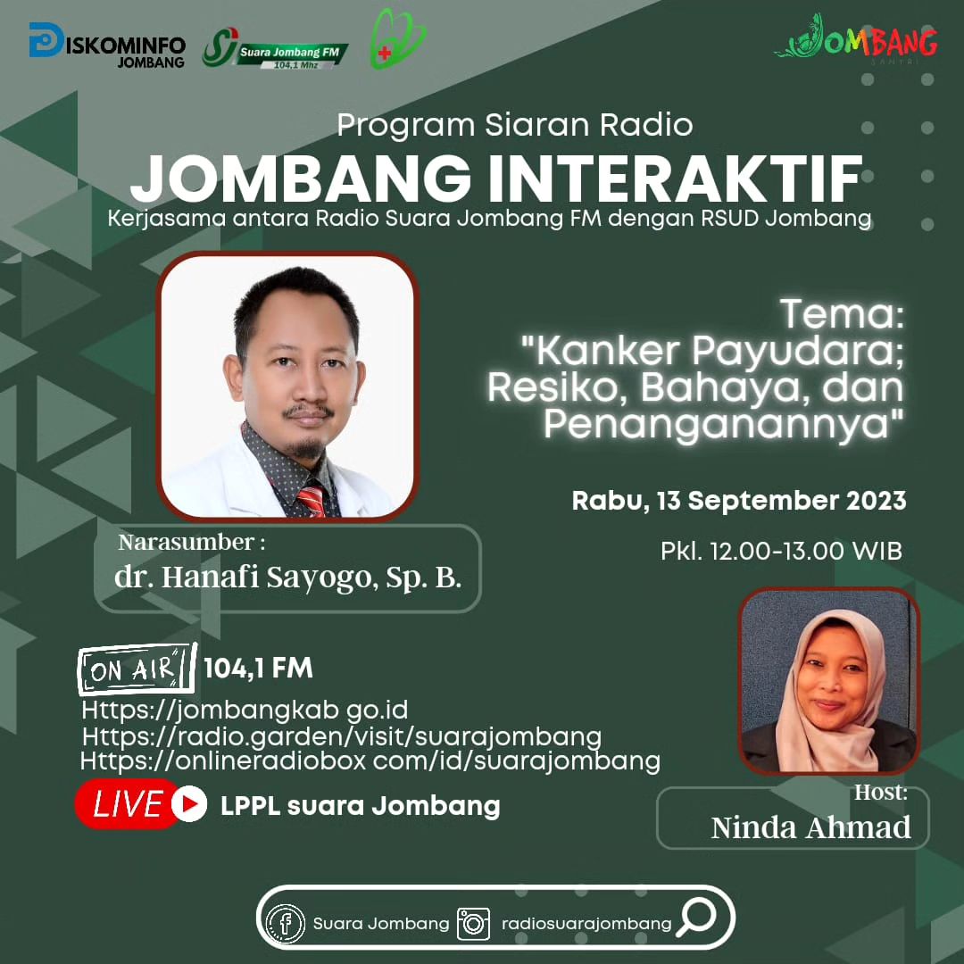 Talkshow Radio: Kanker Payudara, Resiko, Bahaya dan Penanganannya dengan narasumber dr. Hanafi Sayogo, Sp.B, dokter spesialis bedah RSUD Kabupaten Jombang. (13/09/2023)
