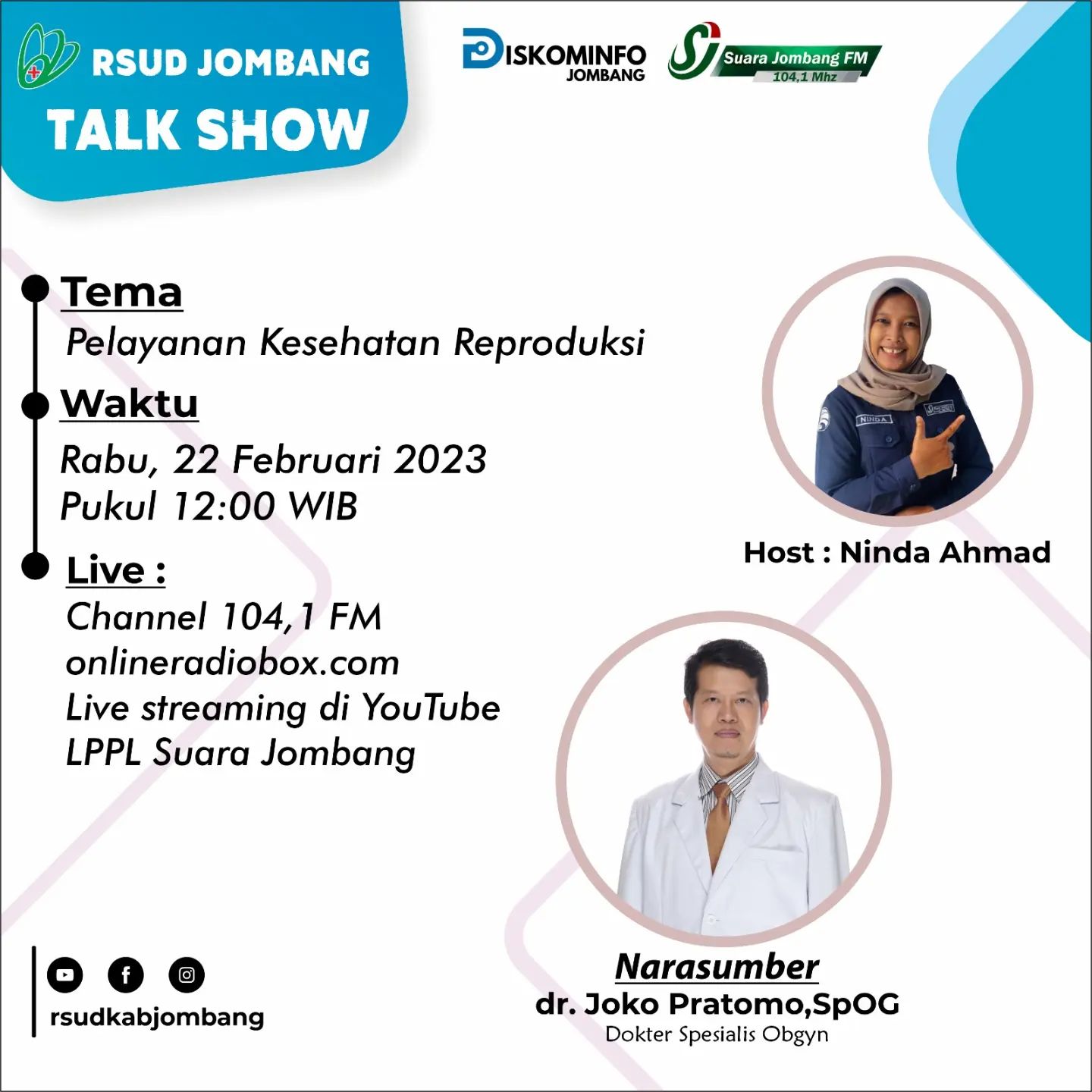 Talkshow bersama narasumber dr. Joko Pratomo, Sp.OG, dokter spesialis kandungan RSUD Kabupaten Jombang dengan tema Pelayanan kesehatan reproduksi di Radio Suara Jombang FM (22/02/2023)