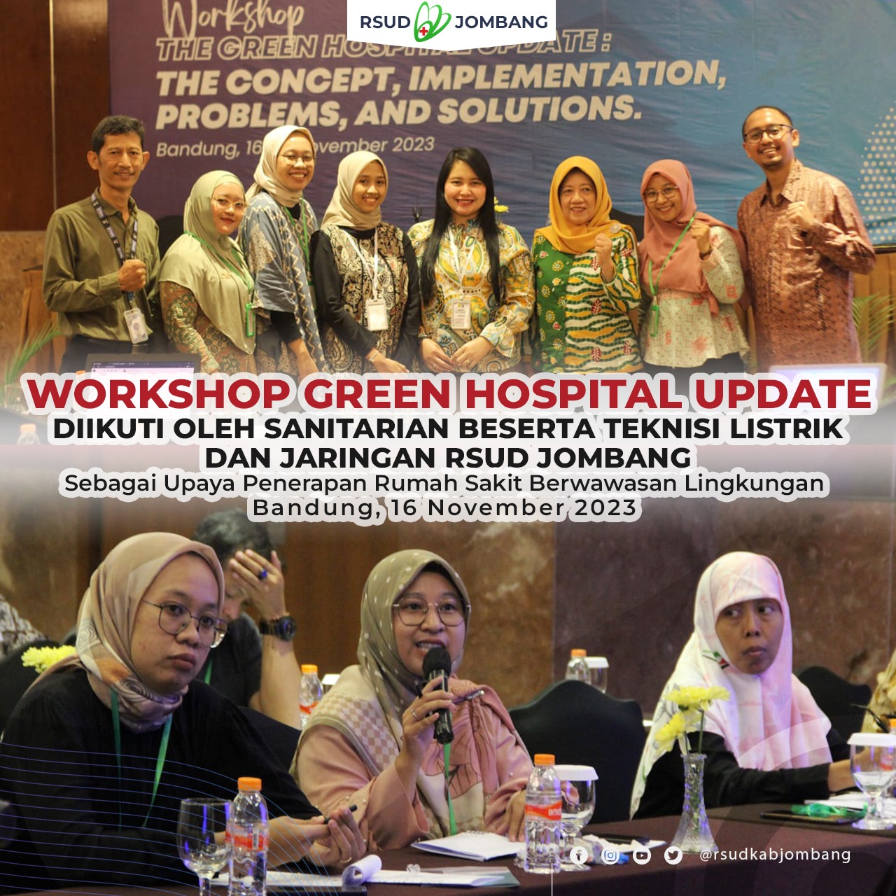 Workshop Green Hospital Update, di Bandung mulai 16-18 November 2023 yang diikuti oleh Sanitarian beserta Teknisi Listrik dan Jaringan RSUD Jombang, sebagai upaya penerapan Rumah Sakit berwawasan lingkungan.